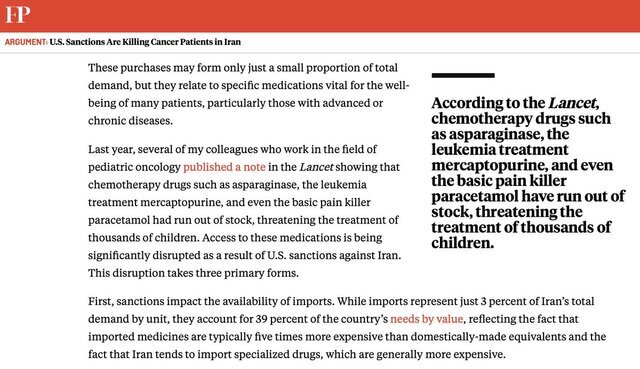“Last year, several of my colleagues who work in the field of pediatric oncology published a note in the Lancet showing that chemotherapy drugs such as asparaginase, the leukemia treatment mercaptopurine, and even the basic pain killer paracetamol had run out of stock, threatening the treatment of thousands of children. Access to these medications is being significantly disrupted as a result of U.S. sanctions against Iran,” says the writer.