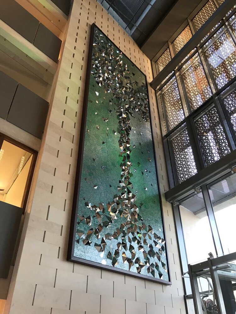 “Tree of Life” measures 9.2 x 3.3 meters and has been created with about 3500 hand-painted ceramic flat tiles of different geometric shapes, 360 irregular pyramids composed of stainless-steel mirrors and thousands of hand-painted ceramic pieces bearing Persian calligraphic motifs.