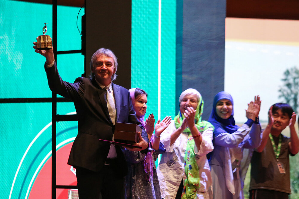 Photo: A winner holds his Golden Butterfly Award during the closing ceremony of the 32nd International Film Festival for Children and Youth at Isfahan’s City Center Cineplex on August 26, 2019.