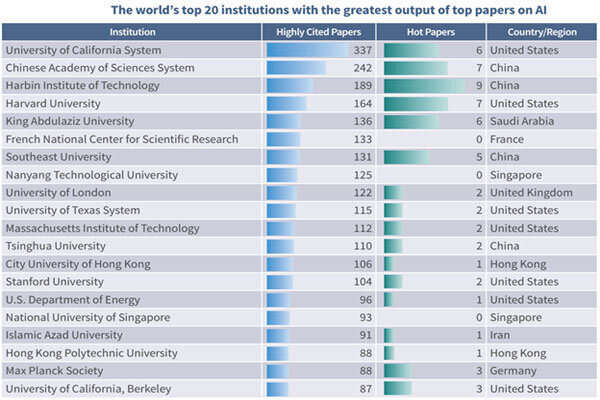 The Islamic Azad University ranked at the 17th place among the top 20 institutions with the greatest output of top papers on AI, above Hong Kong Polytechnic University, Max Planck Society and the University of California, Berkeley.