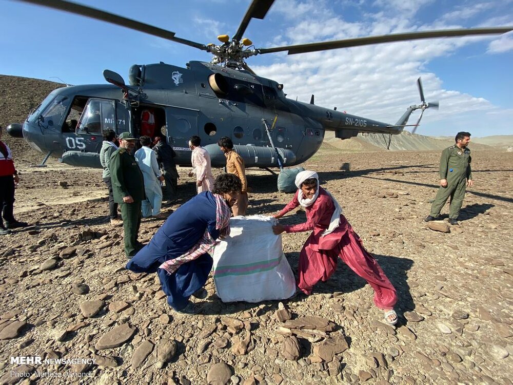 Photo: Flood victims unload food and relief material from an IRGC Air Force helicopter near Jask in Hormozgan Province, January 14, 2020. (Mehr/Morteza Akhundi)