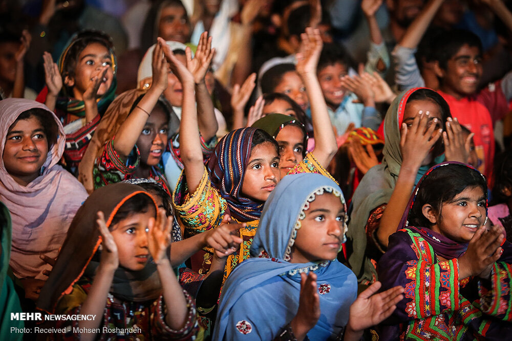 Photo: Flood-stricken children in Sistan-Baluchestan Province attend an open-air performance staged by cultural organizations on January 21 arranged to help lift up their spirits. (Mehr/Mohsen Roshandeh)