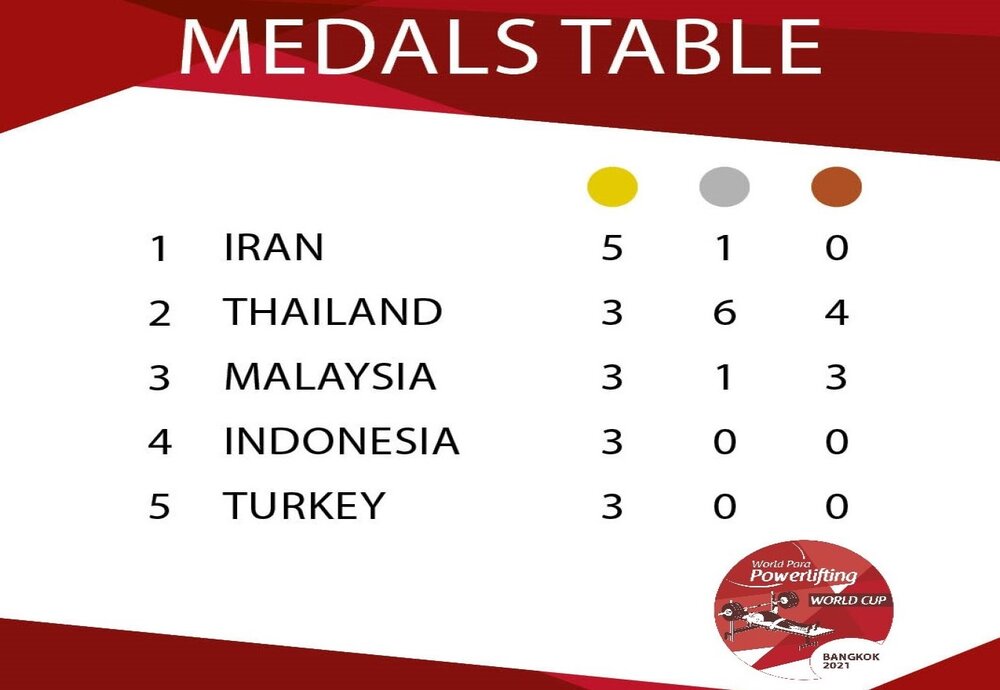 TEHRAN – Iran finished in the first place at the 2021 World Para Powerlifting World Cup medal table in Bangkok, Thailand on Saturday.