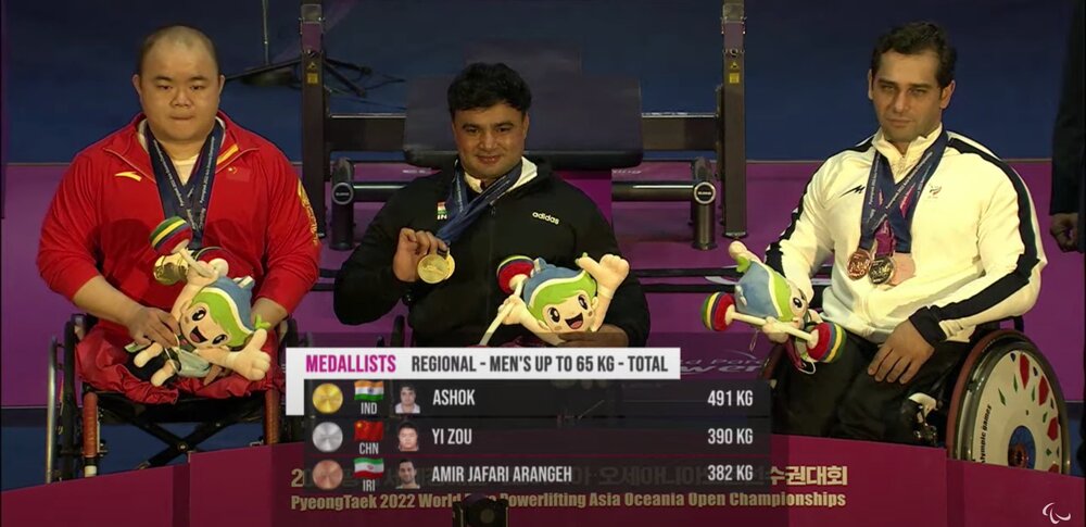 TEHRAN – Amir Jafari Arangeh of Iran claimed a bronze medal in total lift of the Men's Up to 65kg of the 2022 Asia Oceania Open Para Powerlifting Championships on Friday.