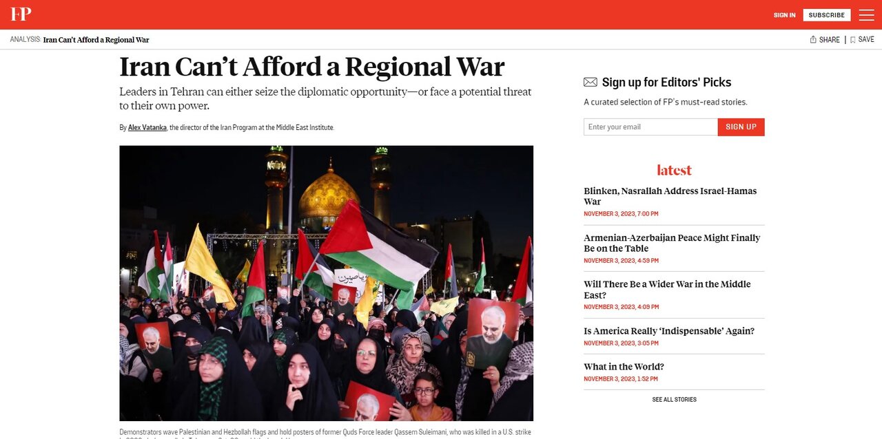 For instance, on November 2, 2023, Alex Vatanka wrote an article in the Foreign Policy magazine titled "Iran Can’t Afford a Regional War" in which the writer said: “As the Israel-Hamas war rages on, Iran’s role will continue to be a pivotal question. While Tehran no doubt feels vindicated in its model of armed campaign against Israel, it will likely not seek escalation by confronting Israel and the United States militarily. Instead, Iranian officials seem to consider the war as a moment to elevate Tehran’s image in the Islamic world—and in the global south generally”.