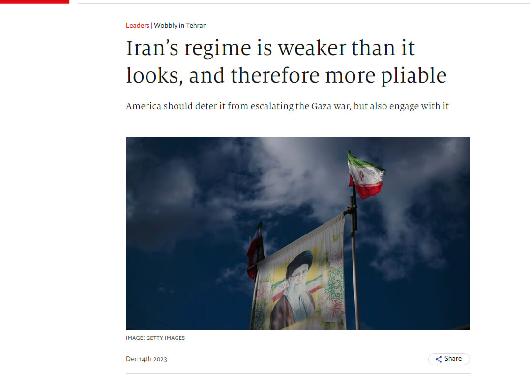 TEHRAN- “Iran’s regime is weaker than it looks, and therefore more pliable” is the title of an article posted on the Economist website on December 14.