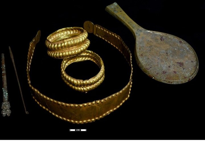 Two identical golden bracelets, one golden forehead band, one handle-less engraved mirror, and two kohl containers are the new properties added to the prestigious list.