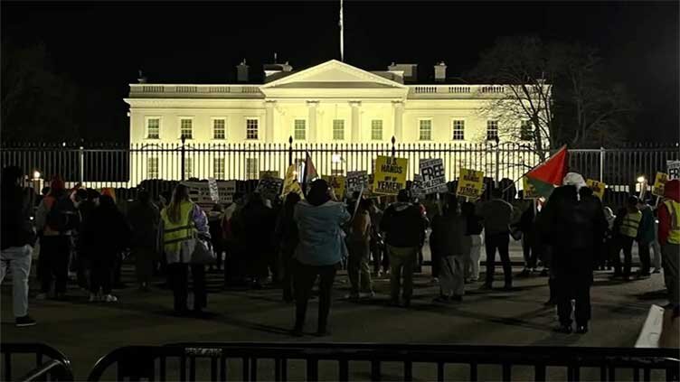 The demonstrators near the White House waved Palestinian flags and carried banners that read "Free Palestine" and "Stop bombing Yemen."