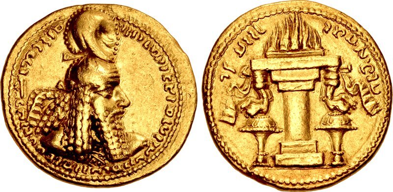 The reverse of Sasanian drachms depicted an Atashtan, a ‘fire altar’, sometimes flanked by incense burners or attendants, often representing Magi or Zoroastrian priests. Contrary to common belief, Zoroastrians do not worship fire itself but communicate with God, known as Ahura Mazda, through the holy flame. The presence of the Atashtan on Sasanian coins mirrors the cross on the coins of their rivals, the Late Roman/Byzantine Empire.