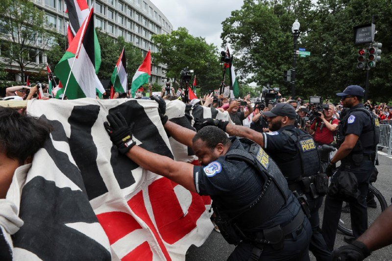 As House Speaker Mike Johnson invited “his excellency Benjamin Netanyahu” to take the podium and address the assembly, thousands of protesters gathered outside the domed edifice, displaying effigies of a blood-stained Netanyahu, waving Palestinian flags, and chanting "Free Palestine."