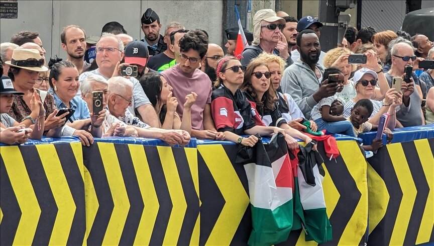 As cyclists passed the 20th arrondissement of Paris, demonstrators displayed Palestinian flags and some wore keffiyehs, a well-known symbol of Palestinian nationalism.