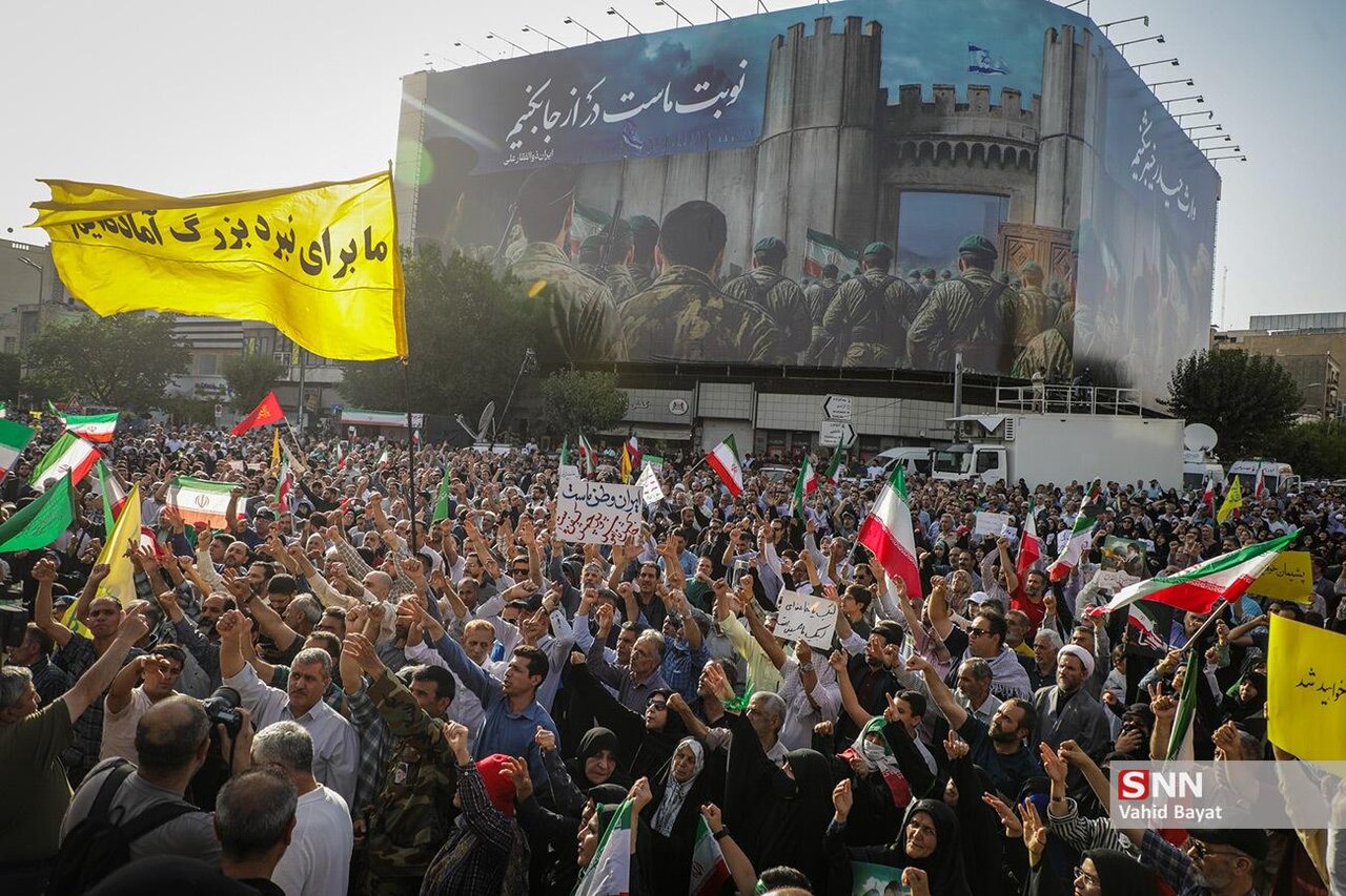 Tehran’s Enghelab Square erupts in fury over U.S. strikes; president joins crowd