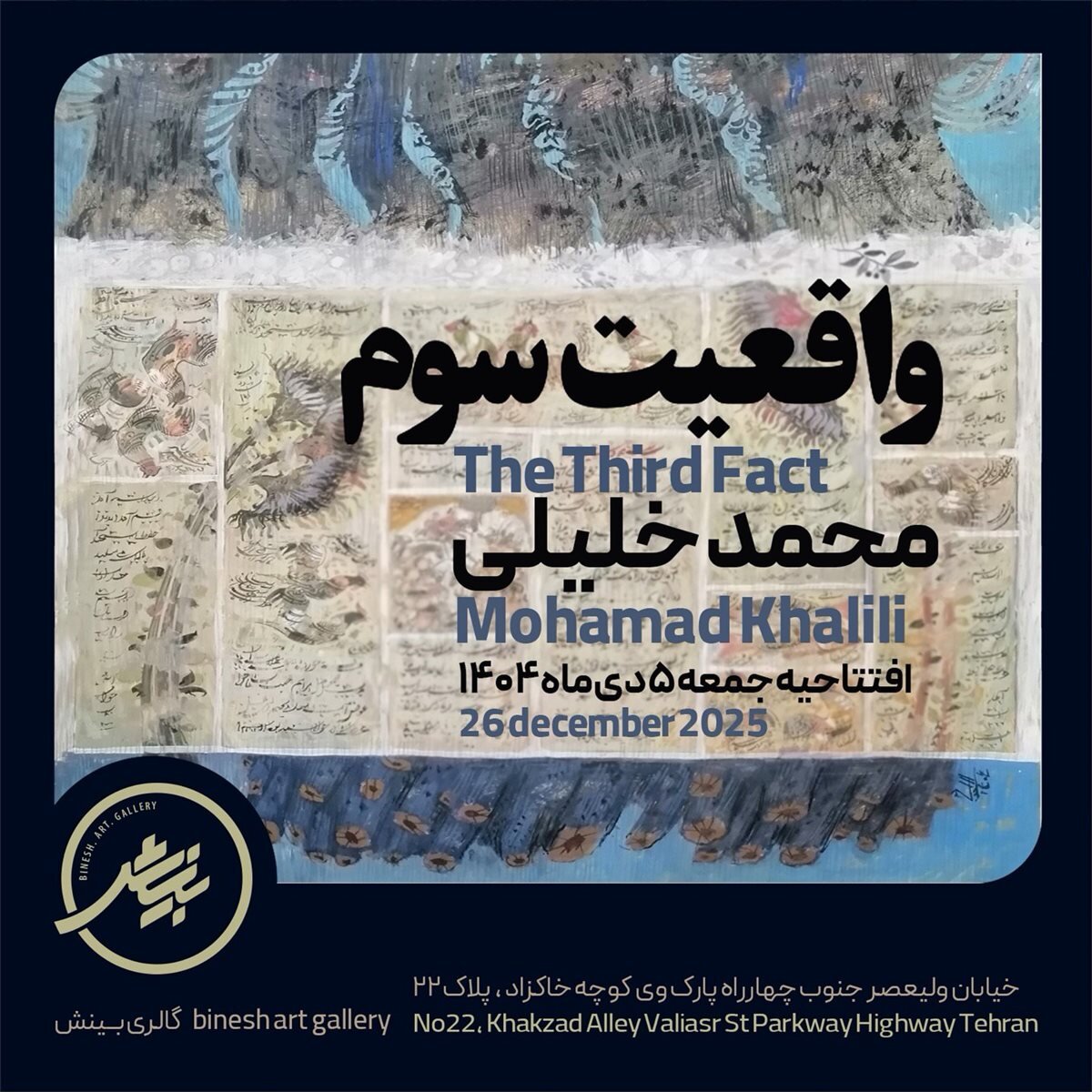 A collection of paintings by Mohammad Khalili is currently on display in an exhibit at Binesh Gallery.  Named “The Third Fact”, the exhibition runs until January 3, 2026 at the gallery located at 22 Khakzad Alley, Vali-e Asr Ave.