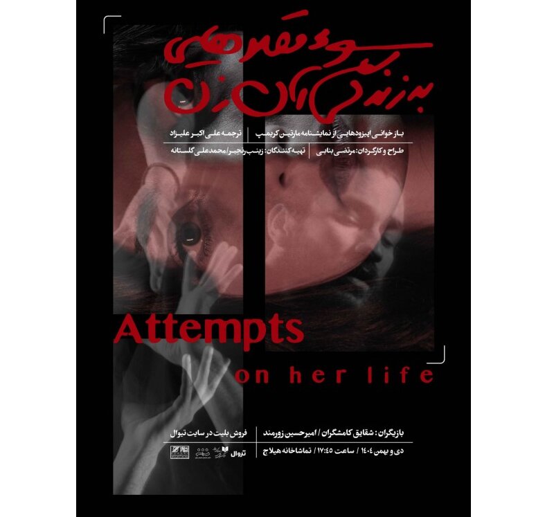 “Attempts on Her Life” will remain on stage until January 23 at the Hilaj Theater, located at No. 22, Samandarian (Mohajer) Alley, Iranshahr St., Karim Khan Zand Blvd.
