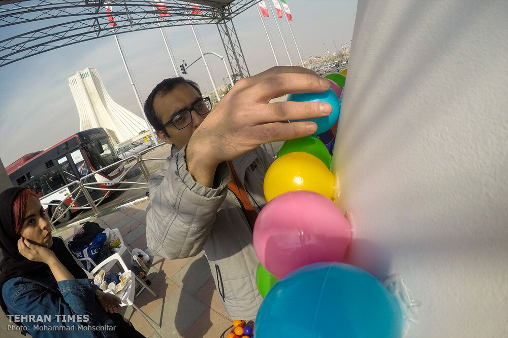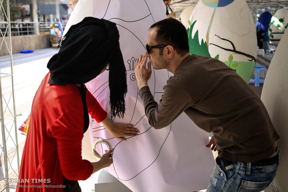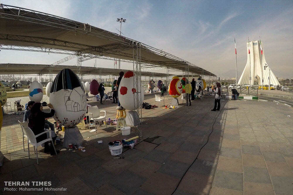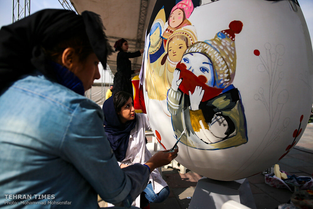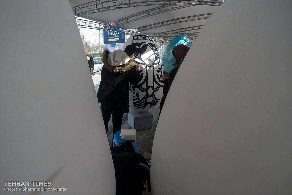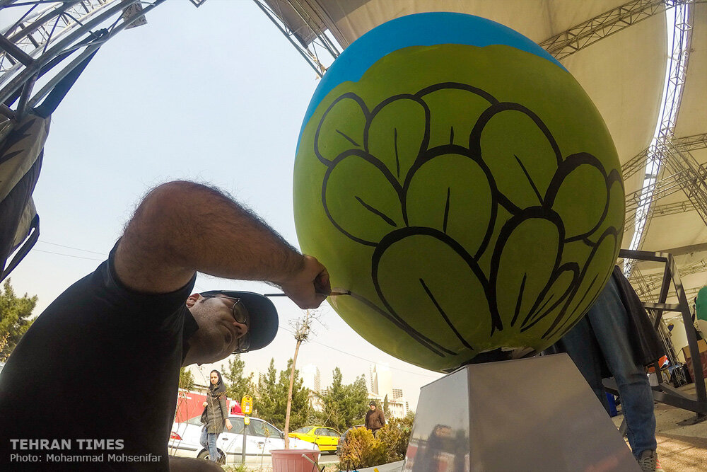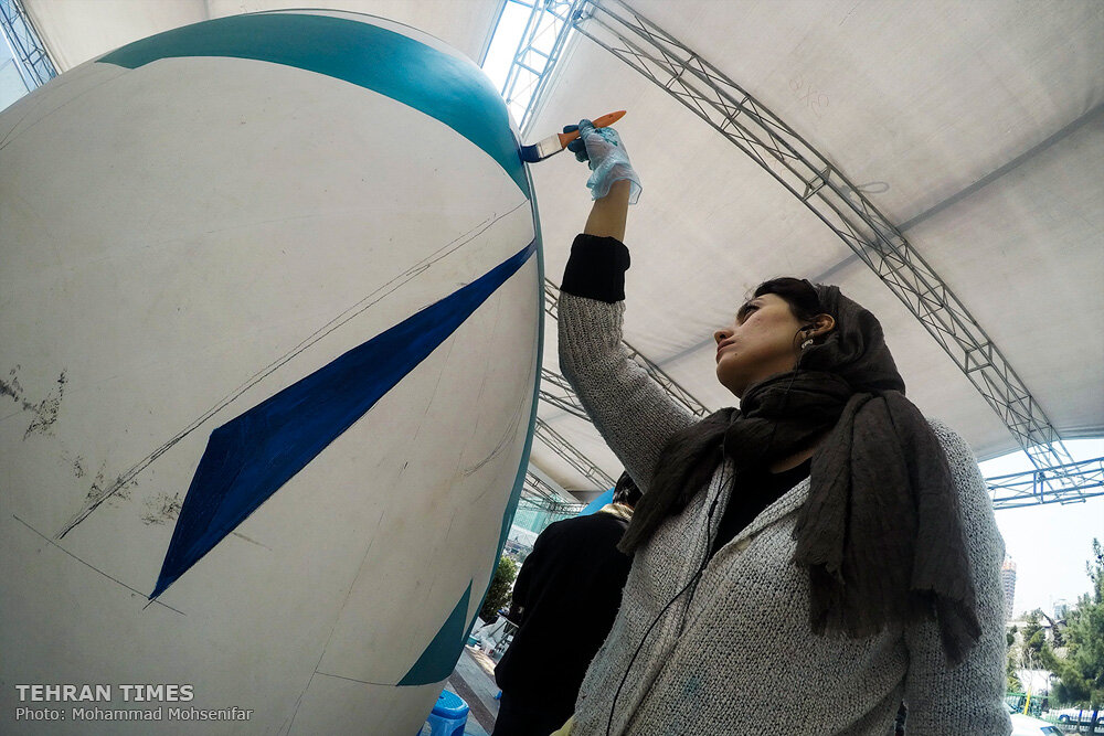 Citizens paint massive egg-shaped statues in an arts festival being held in several neighborhoods across Tehran, March 13, 2019.