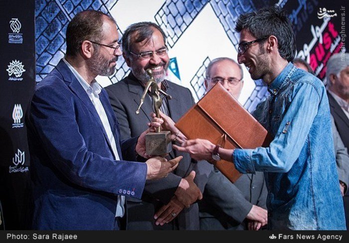 Photo: A cartoonist receives an award from Art Bureau Director Mohsen Momeni (L) during the closing ceremony of the 2nd International Holocaust Cartoons Contest in Tehran on May 30, 2016. (Fars/Sara Rajai)