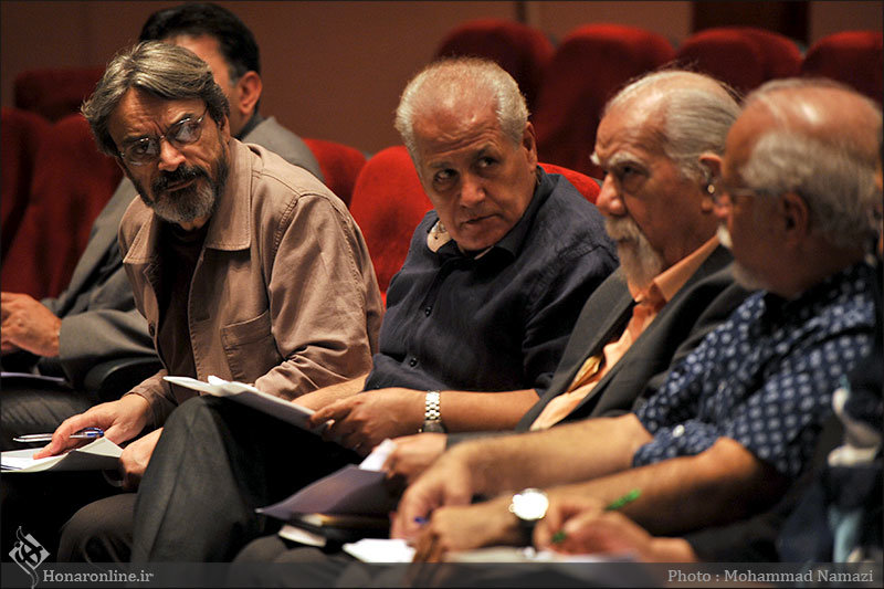Left to right, top musicians Hossein Alizadeh, Nasrollah Nasehpur, Dariush Pirniakan and Mehdi Azarsina, all jury members for the 10th National Festival of Youth Music, exchange views after a performance at Tehran’s Rudaki Hall on August 28, 2016. The festival runs until September 14. (Honaronline/Mohammad Namazi)
