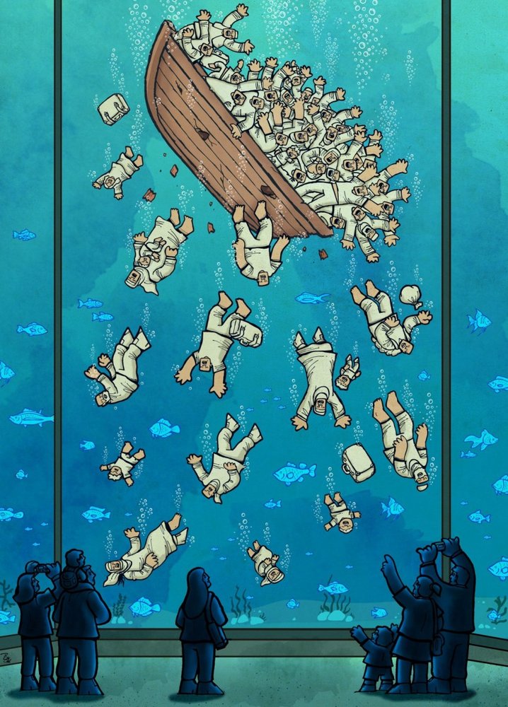 He received the prize for his untitled work, which shows some European people watching a group of Middle Eastern refugees drowning in an aquarium.