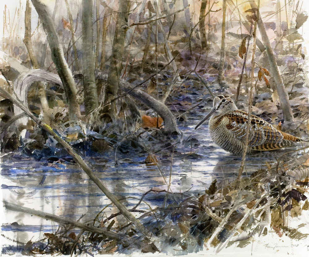 A: Basically I look upon illustrations and paintings as different branches of the same tree. They are both a part of me. An illustration for a field guide though have very precise purpose, to help people recognize a bird and that comes with strict limitations in the expression. My free paintings, which are usually done in the field, while looking through a spotting scope, show basically an impression of the bird. It makes me much happier to exclude details or use light effects. Still I always want to have what I call “presence” in both my illustrations and in my paintings. The feeling of being right there, experiencing the living bird outdoors, right now. These days I do very few direct illustrations and concentrate more on my artwork. When you are painting for a field guide, the research is very important and you need to plan the plate very carefully, it takes much more time. I work rather fast when it comes to painting in watercolor outdoor, I may finish a smaller painting in one or two hours.