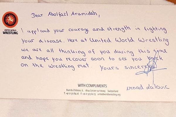 “I applaud your courage and strength in fighting your disease. Here at United World Wrestling we are all thinking of you during this time and hope you recover soon to see you back on the wrestling mat,” Lalovic wrote a note sent to Iran Wrestling Federation.