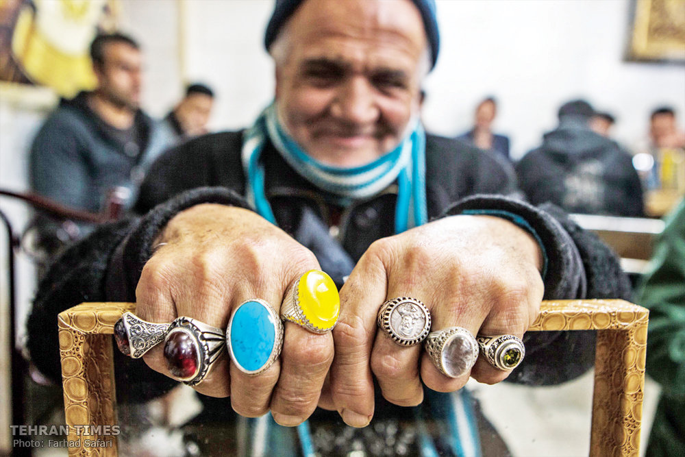 The photo shows an old man in a traditional bazaar in Qazvin, central Iran, wearing a number of ornamental rings. The rings, with precious, colorful pieces of stone on their top, are usually worn by men, suggesting macho and religious overtones. The bazaar is the whereabouts of not only the old but the young. At a symbolic level, the jewelry has been associated with cultural heritage and nobility with some rings handed down over generations. Tehran Times/ Farhad Safari