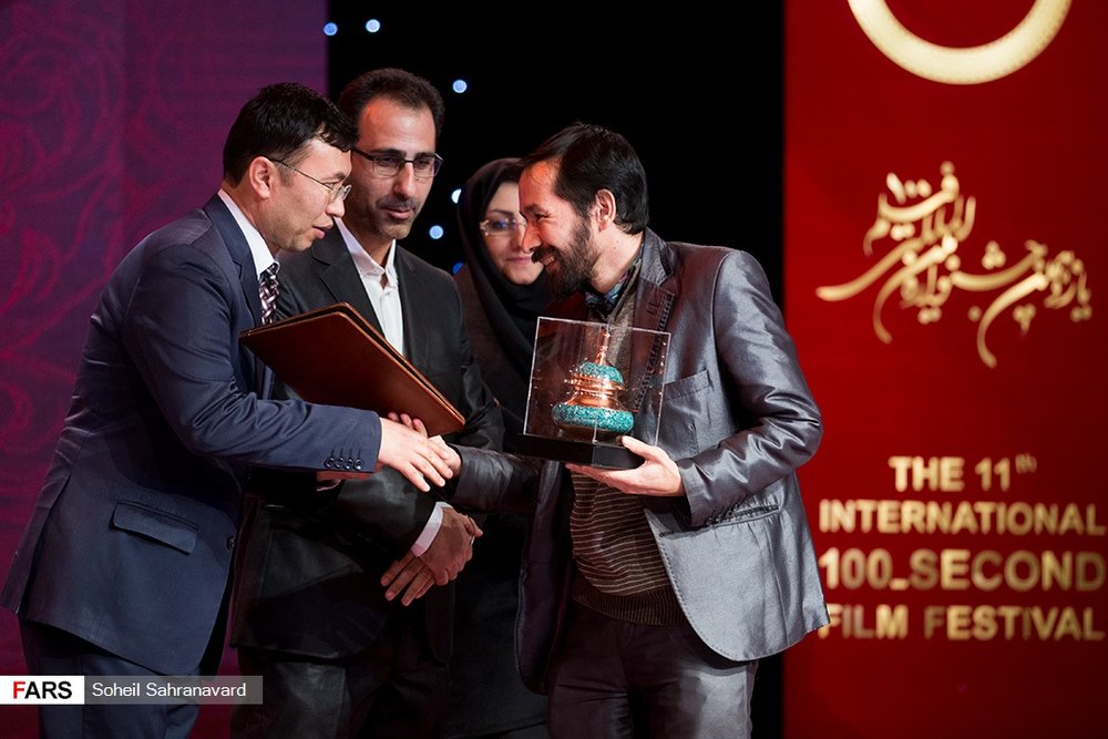 Photo: Afghan filmmaker Ahmad Vahid Omidi (R) accepts the best film award for his “The Fisherman” during the closing ceremony of the 11th International 100-Second Film Festival at the Art Bureau in Tehran on February 24, 2017. (Fars/Soheil Sahranavard)