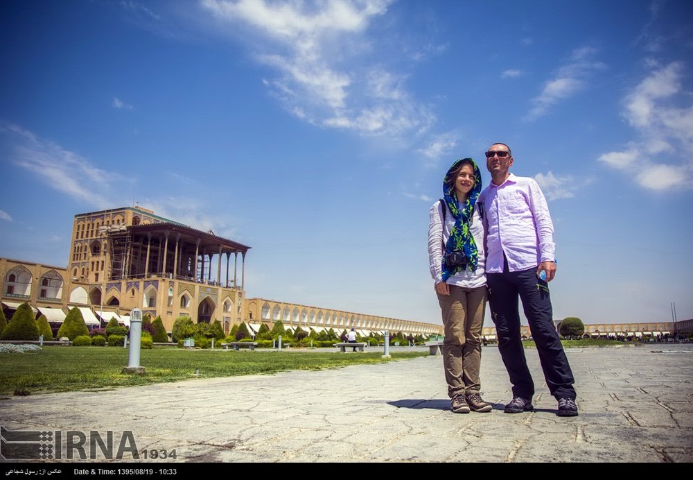 PHOTO: A Westerner couple pose for a photo at the enormous historical Imam Square in Isfahan on November 9, 2016. The sixth-story Safavid-era Ali Qapu Palace in also seen in the background. (Tehran Times/ Rasul Shojaei)