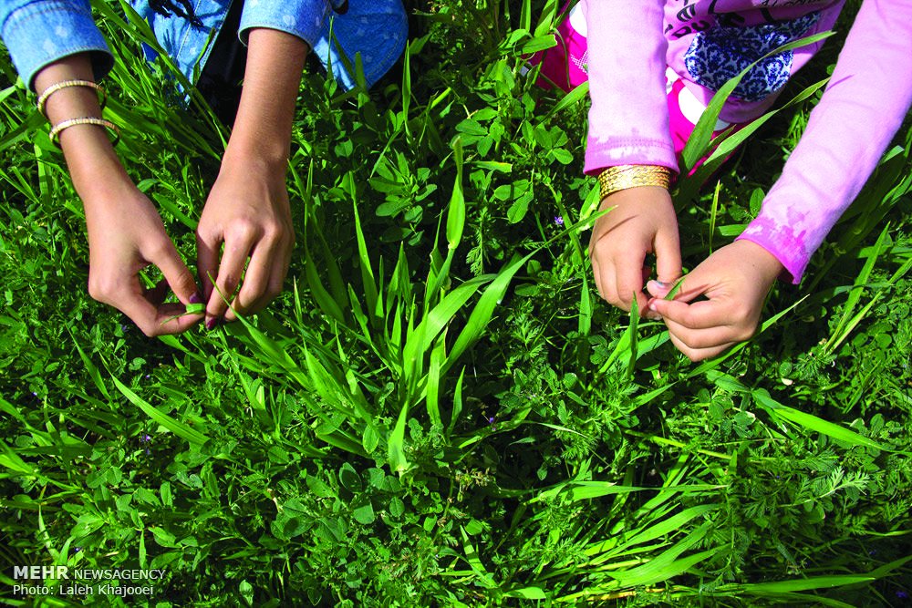 The hands of young ladies is seen tying together blades of grass in hope of finding their ideal husbands as a tradition to mark Sizdah Bedar.