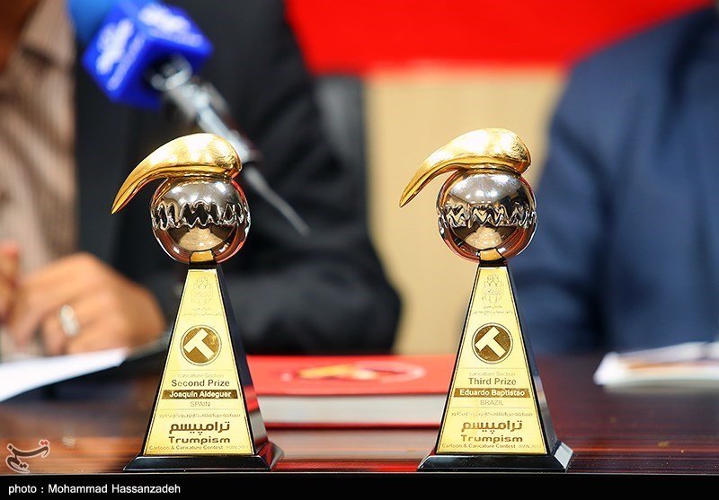 Photo: Trophies are seen during a press conference for the International Trumpism Cartoon and Caricature Contest in Tehran on July 1, 2017. (Tasnim/Mohammad Hassanzadeh)