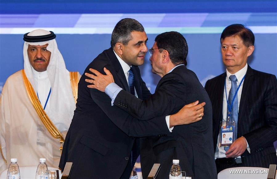 PHOTO: Zurab Pololikashvili (L front), newly-elected secretary-general of the UNWTO, hugs his predecessor Taleb Rifai, in Chengdu, China on Sept. 14, 2017.