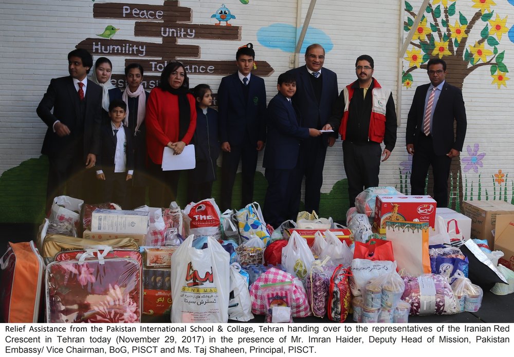 The relief assistance was handed over to the representatives of the Iranian Red Crescent in Tehran on Wednesday in the presence of Imran Haider, Deputy Head of Mission who is also the vice chairman of the Pakistan embassy in Tehran as well a member of the board of governors at school, and Taj Shaheen, the school Principal.