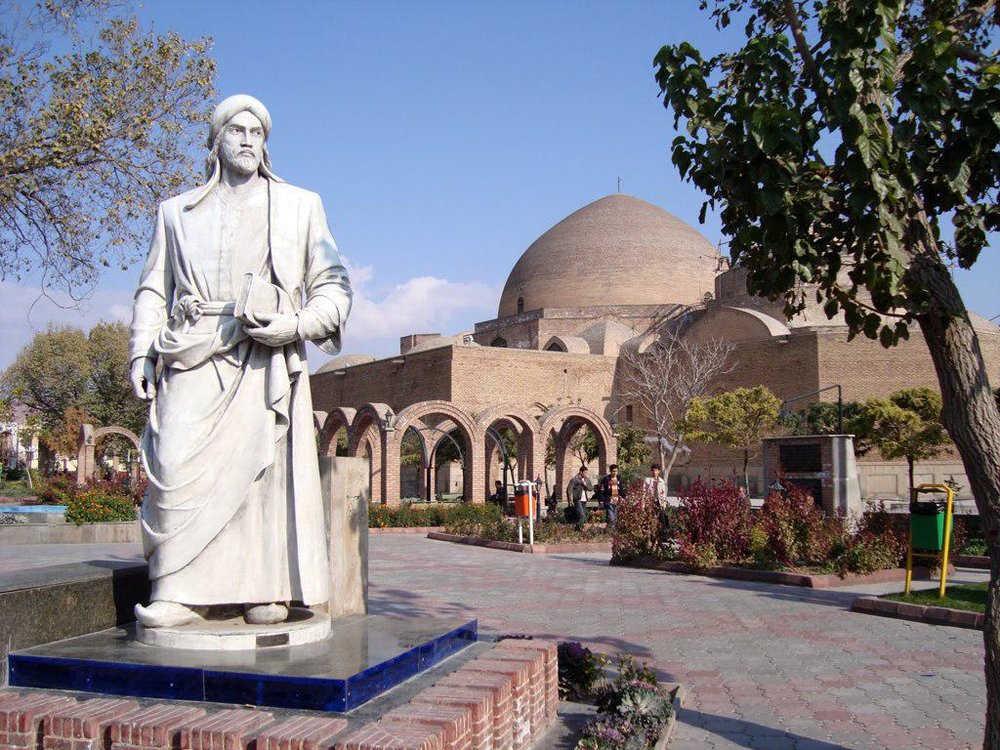 White statue of the Persian poet Khaqani in front of the Blue Mosque in Tabriz, Iran.