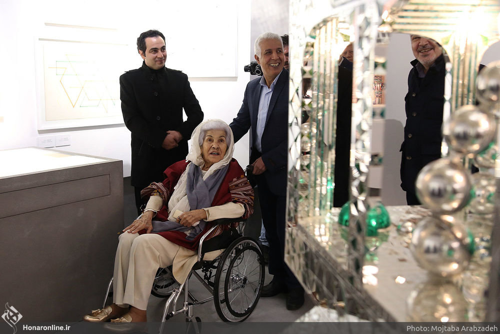 Sitting in her wheelchair, the 95-year-old artist, who is famous for her mirror mosaics and geometric drawings, attended the opening ceremony of the section titled “Monir Hall”, the Persian service of ILNA reported on Saturday.