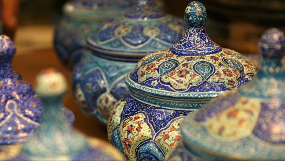 The photo above shows a collection of Iranian potteries meticulously inlaid with enamel