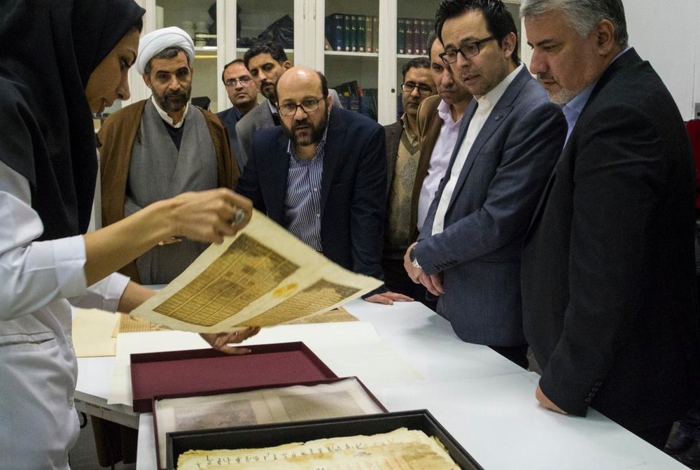 Photo: An expert (L) briefs officials about a restored manuscript during an exhibit at the National Library and Archives of Iran on February 25, 2018. (NLAI)