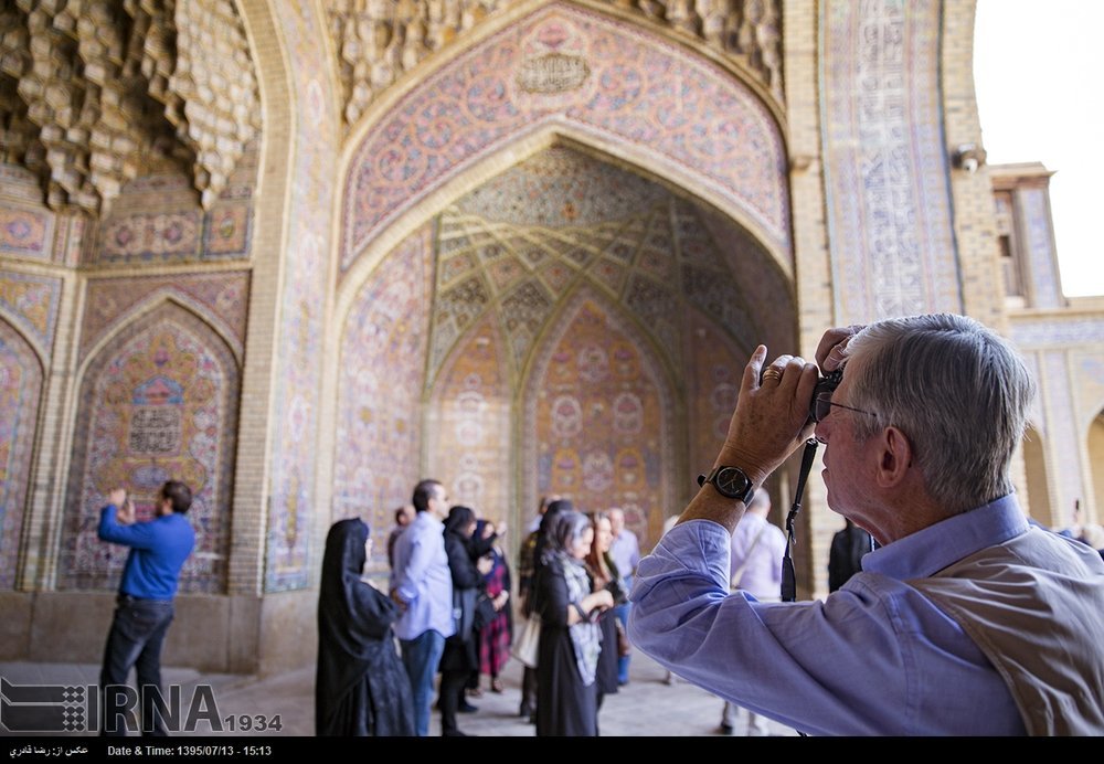 PHOTO: A Western traveler snaps a photo of the intricate stuccowork that embellishes courtyard of Nasir al-Molk Mosque in Shiraz, October 8, 2016. (IRNA/Reza Qaderi)