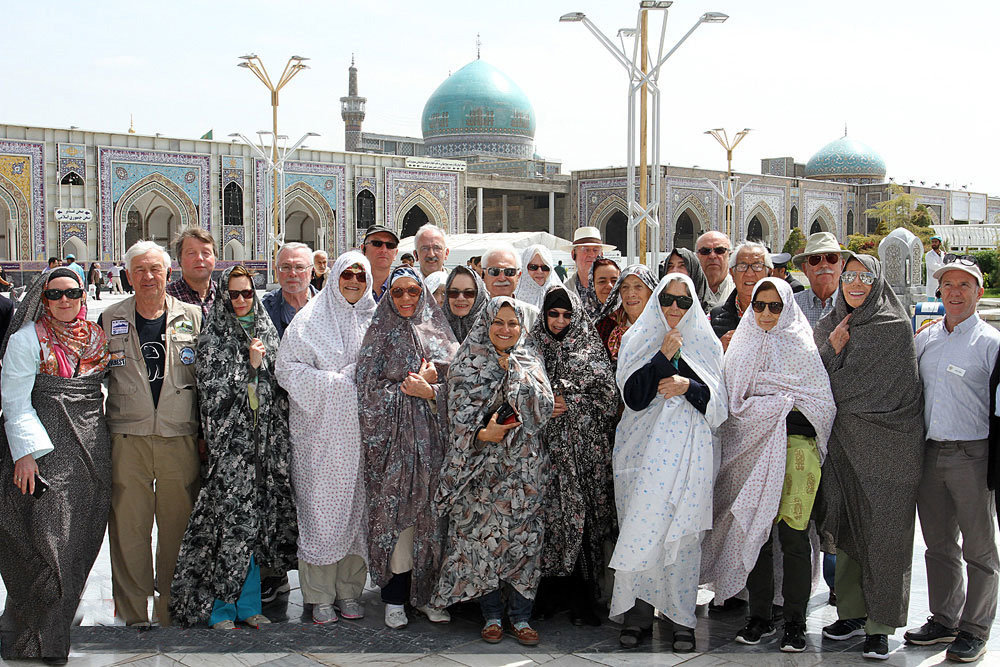 PHOTO: International travelers pose for a photo while visiting the holy shrine of Imam Reza (AS) in Mashhad, northeastern Iran. Women are clad in chadors, shapeless gowns that cover their entire bodies, to respect a dress code required for female pilgrims.