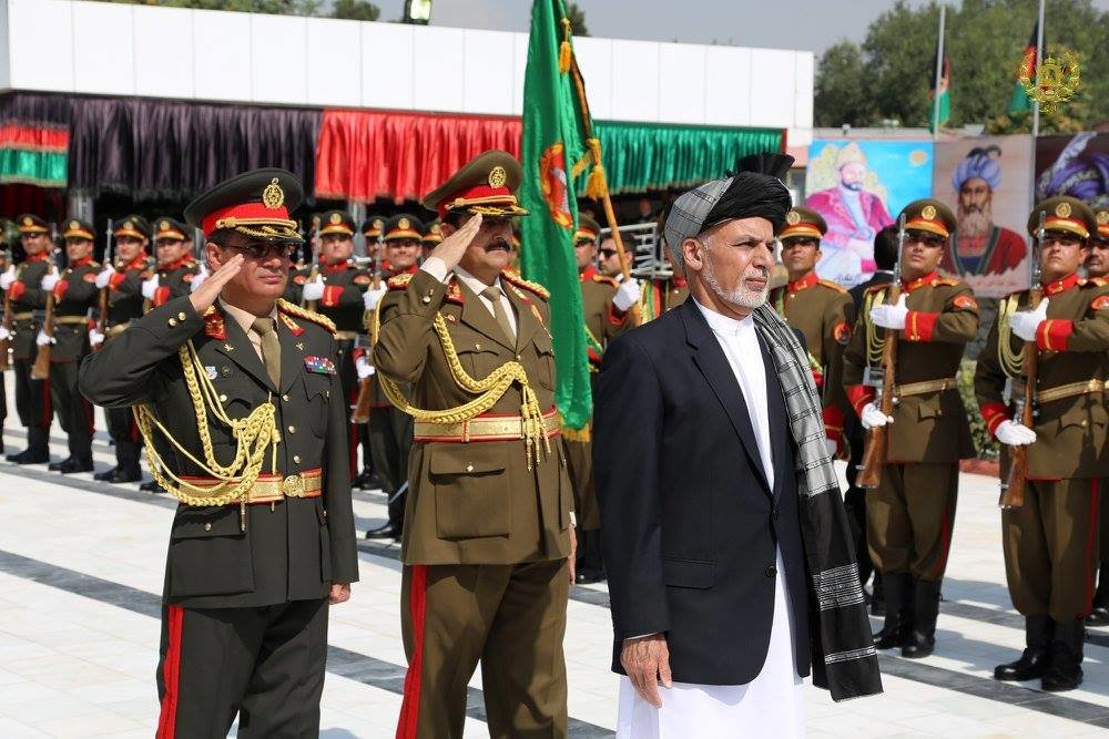 Afghan President Ashraf Ghani laid a wreath at the Independence Minaret during an official celebration inside the Afghan Defense Ministry compound after inspecting guard of honor.
