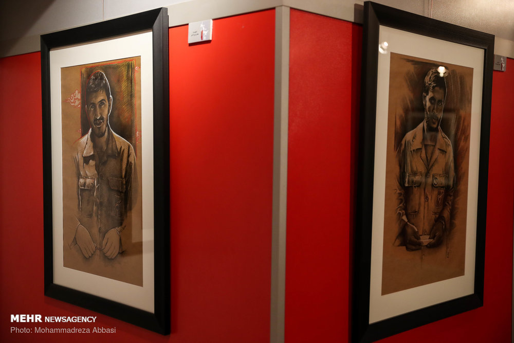 Photo: Portraits of martyrs Mehdi Bakeri (L) and Mohammad Ebrahim Hemmat (R) by Mohammad-Ali Naderi are on display in the Moon Headbands exhibition at Abolfazl Aali Gallery of in Tehran on October 9, 2018. (Mehr/Mohammadreza Abbasi)