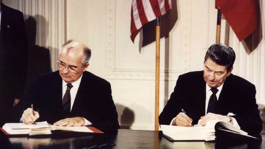 U.S. President Ronald Reagan and Soviet President Mikhail Gorbachev sign the INF treaty, December 8, 1987