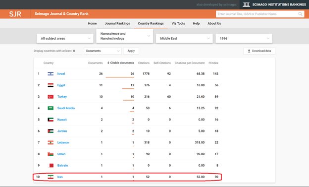 According to the Scimago Journal, Iran's rapid growth in nanoscience, as well as nano-technology, is stunning. In 1996, only a handful of countries had developed this science and technology, with Iran ranking 58th among those 66 countries. Unfortunately, rankings from years prior to 96 are not available on this site.