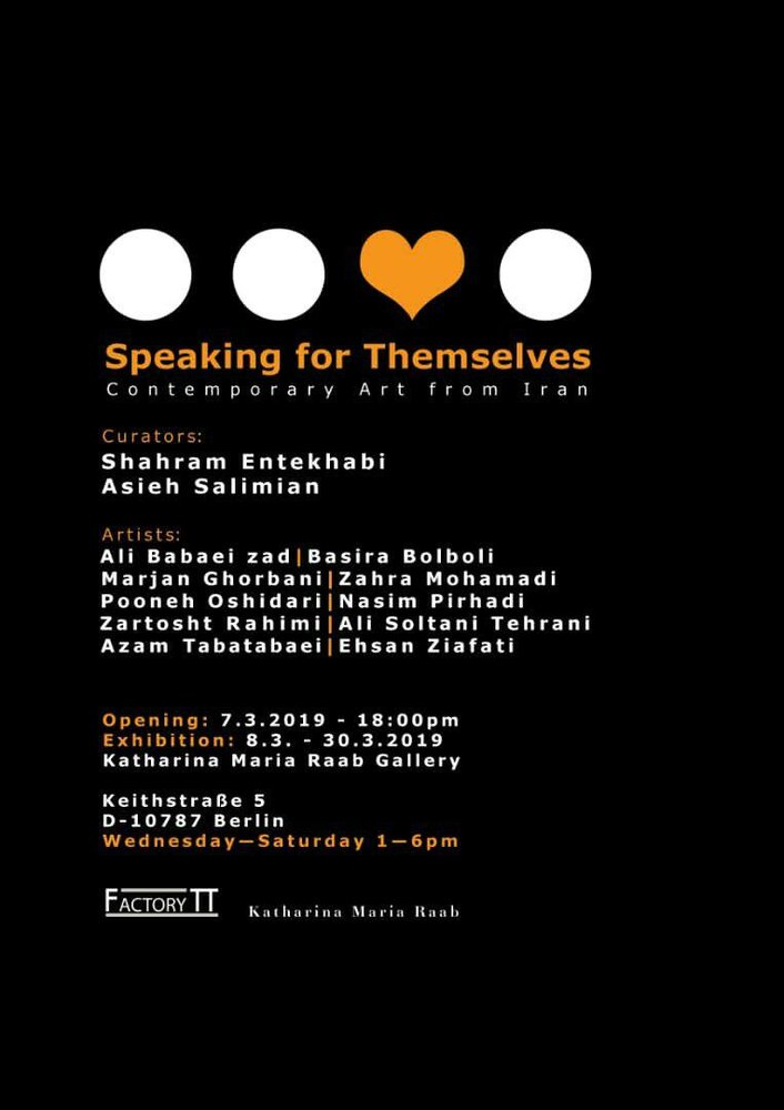 Asieh Salimian and Shahram Entekhabi are the curators of the exhibition “Speaking for Themselves” opening on March 7, the gallery has announced.