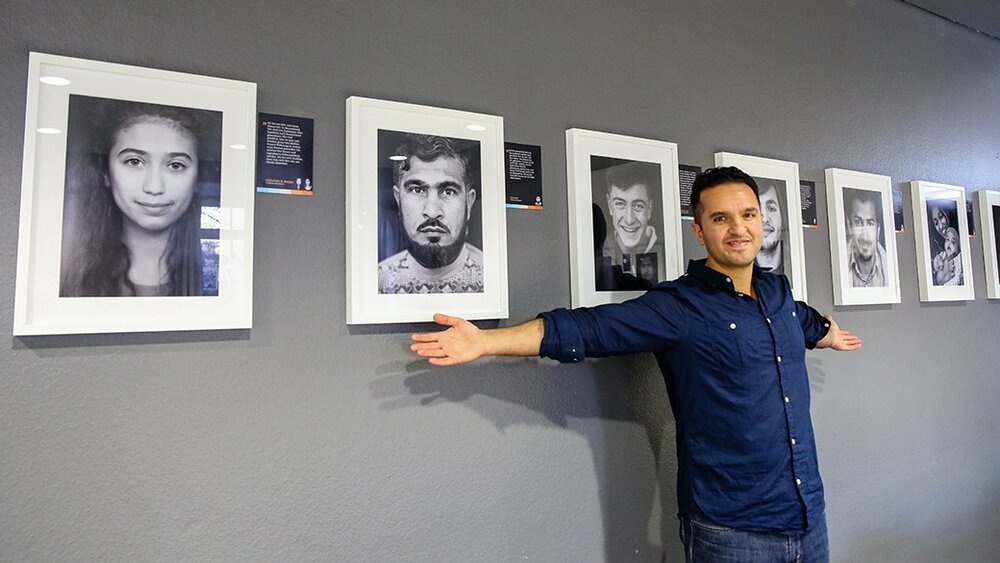 Photo: Germany-based Iranian photographer Arasch Zandieh poses with some of his works on display in the exhibition “Hope” at the University of Gottingen, Germany. (Zandieh.de)