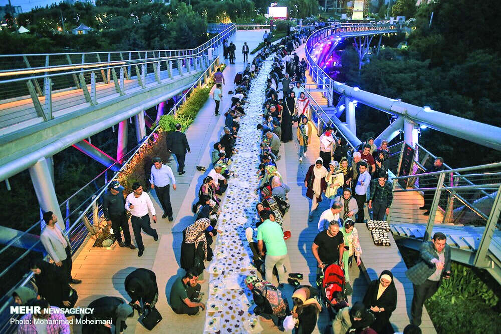 Large numbers of the faithful gather for a communal iftar meal served on Tehran’s Tabiat Bridge, a multilevel, sculptural pedestrian pathway, on May 21, 2019.