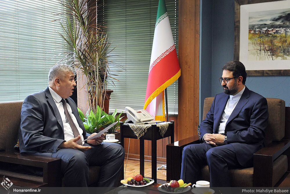 Photo: Uzbekistan Ambassador Bakhodir Abdullaev (L) and Deputy Culture Minister for Artistic Affairs Seyyed Mojtaba Hosseini meet in Tehran. (Honaronline/Mahdieh Babai)