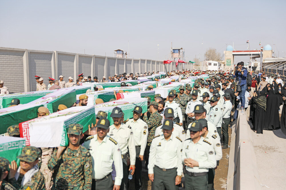 The remains of 44 soldiers martyred during Saddam Hussein’s war against Iran in the 1980s were transferred to Iran via the Shalamcheh border on Thursday and were honored by the people of the border cities of Abadan and Khorramshahr in Khuzestan Province.