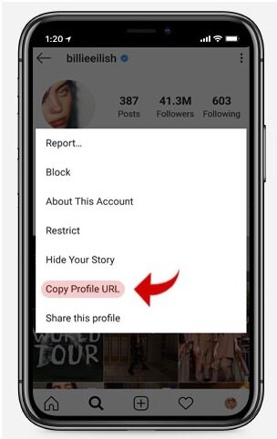 Copy the Instagram username or you go to `menu` and copy profile URL.