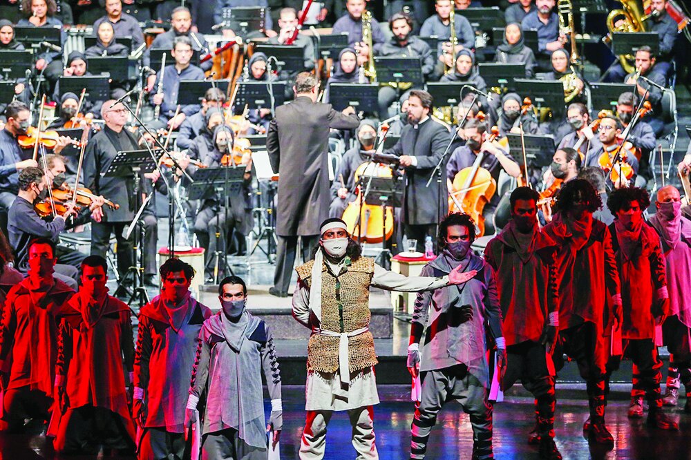 Thespians accompany the Tehran Symphonic Orchestra performing the symphonic poem “Alamdar” at Tehran’s Vahdat Hall on September 5, 2022.