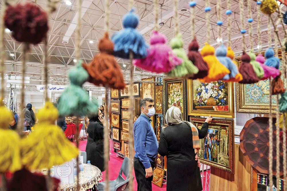A couple looks at handcrafted tableau rugs on display at the 12th Pars international tourism fair, which was inaugurated in the ancient city of Shiraz on January 10, 2023. B2B meetings, cultural evenings, folk music performances, live handicrafts, and culinary workshops are among the highlights of the four-day event.