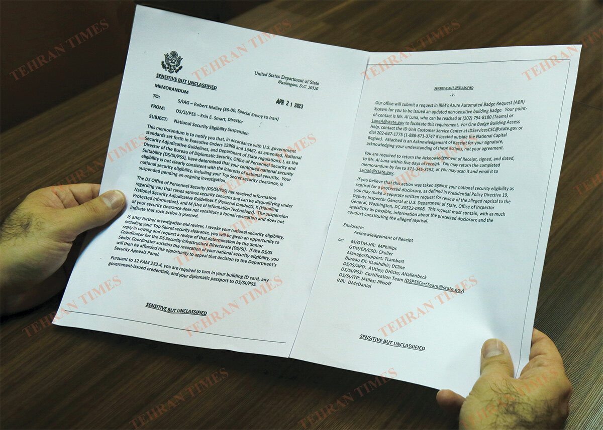 The latest scoop from the Tehran Times about Rob Malley's dismissal elicited many reactions, some of which expressed awe at how the Tehran Times got a whiff of the tightly kept matter. Malley was asked to turn in his building ID card, any government-issued credentials, and his diplomatic passport, according to the memorandum.